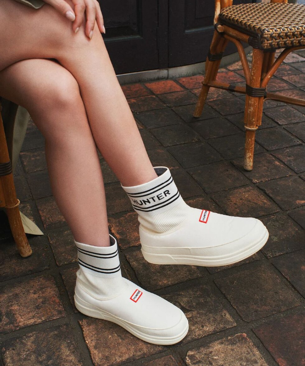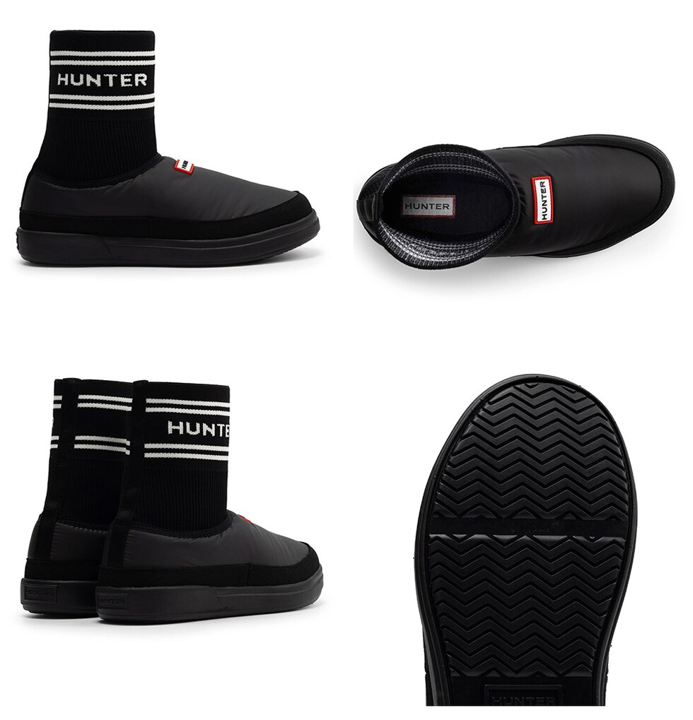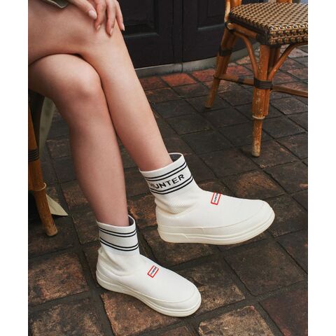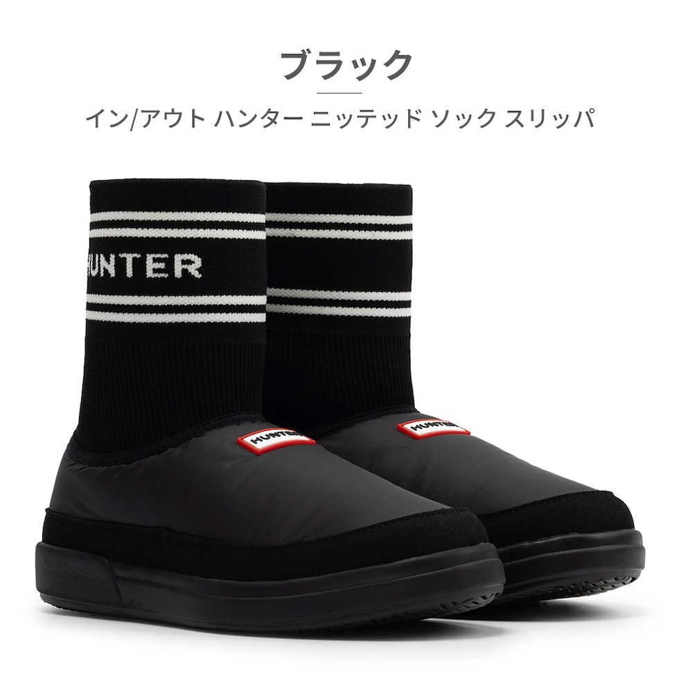 履きやすいブーティスタイルで、靴下の履き口にはハンターのブランドロゴがあしらわれています。