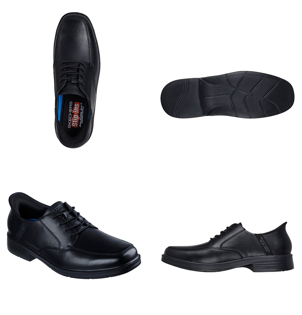 レザーと合成素材のアッパーに、履きやすさを追求したツインゴアパネル、クッション性のあるSkechers Memory Foamのインソールが特長です。