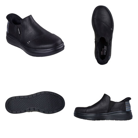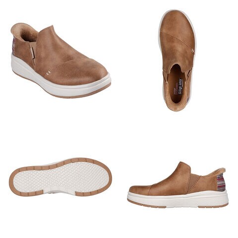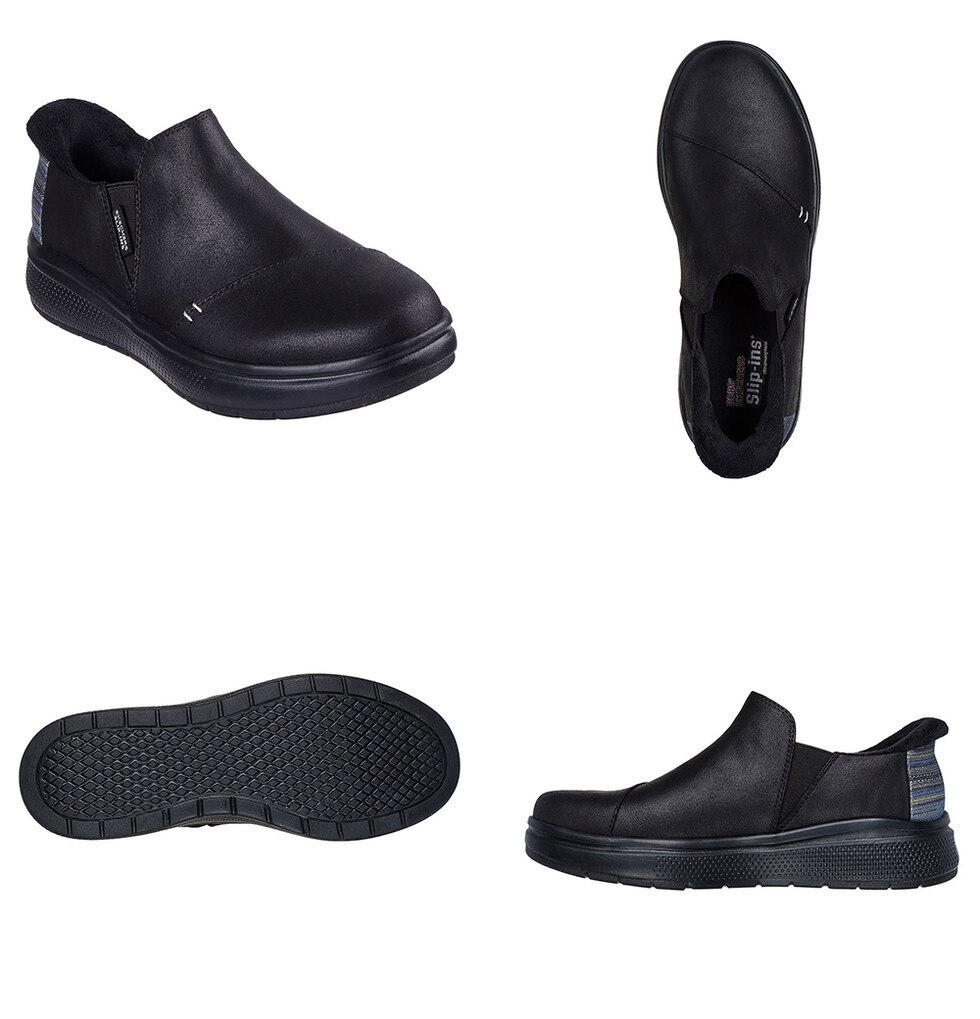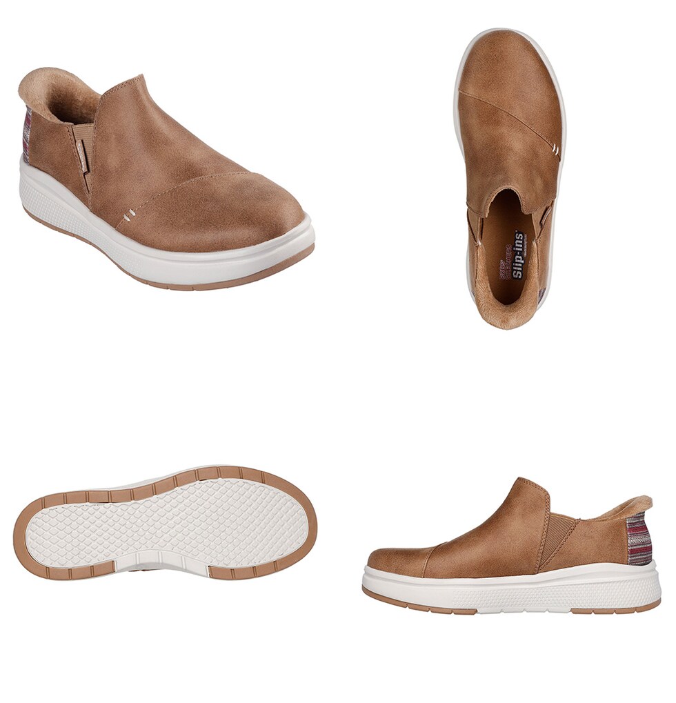 フェイクファーの縁を施した、ヴィーガン(動物由来成分を含まない)レザーのアッパー、ストライプの縁取りを施したヒール、クッション性のあるSkechers Memory Foam(スケッチャーズ メモリーフォーム)インソールが特長です。
