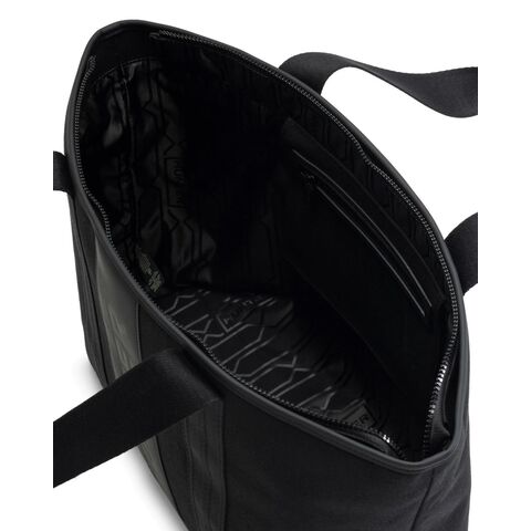 バッグの持ち手はラバー加工を施した100% ポリウレタンで、ハンターブランドのデボス加工が施されています。裏地は100%リサイクルポリエステル素材で、内側に小さな貴重品を入れるのに便利なジップポケットと、底の汚れ防止のためバックの底の四角に底鋲が付いています。