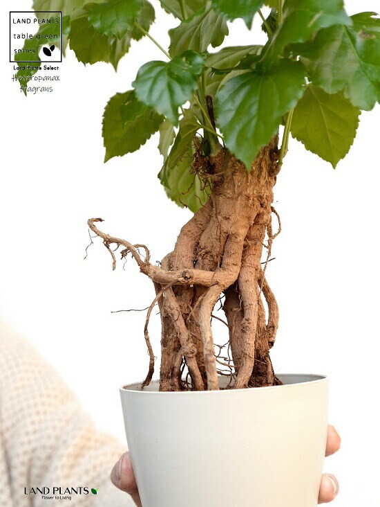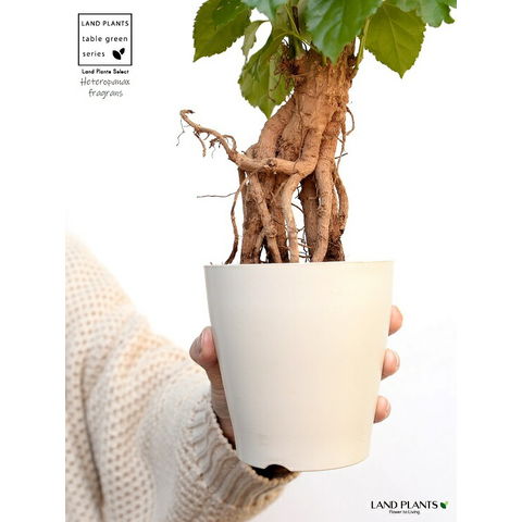 見た目がガジュマルに似ていますが、ヘテロパナックという植物です。流通も少なく、普段は見かけることがないですが、独特の根が人気の植物です。
