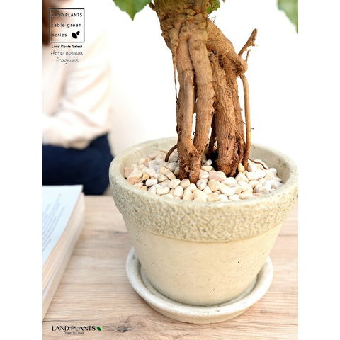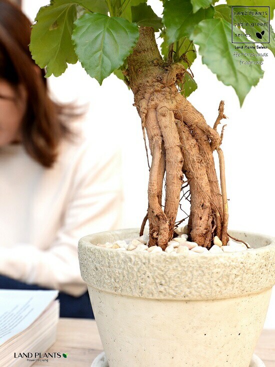 見た目がガジュマルに似ていますが、ヘテロパナックという植物です。流通も少なく、普段は見かけることがないですが、独特の根が人気の植物です。