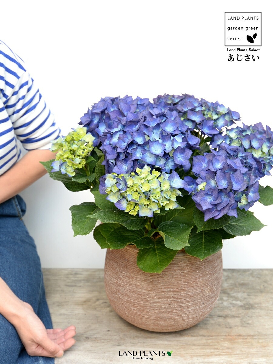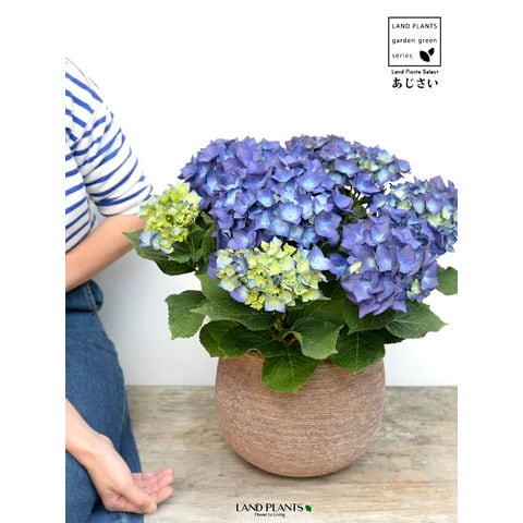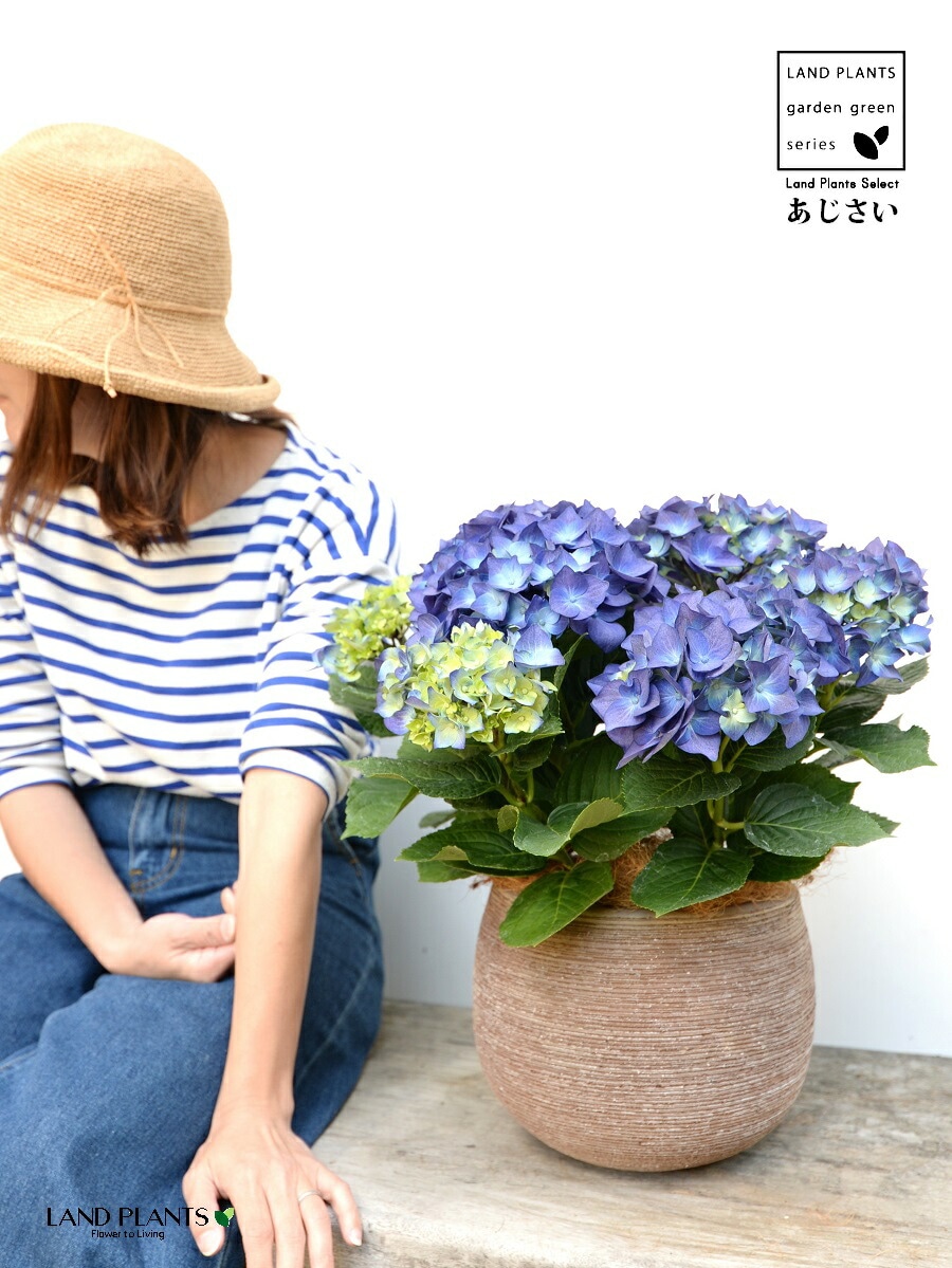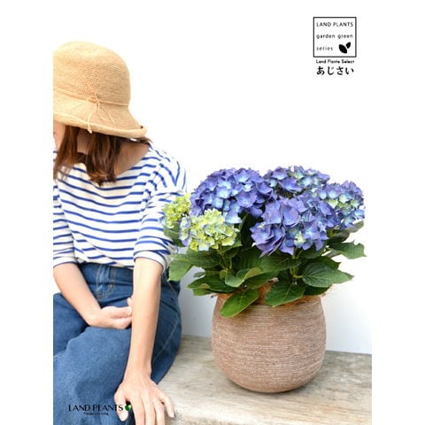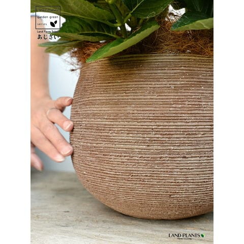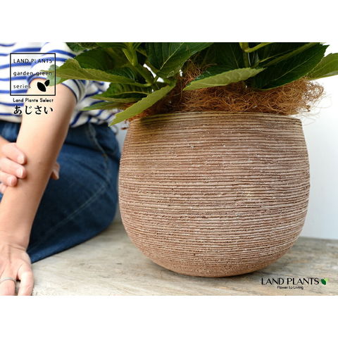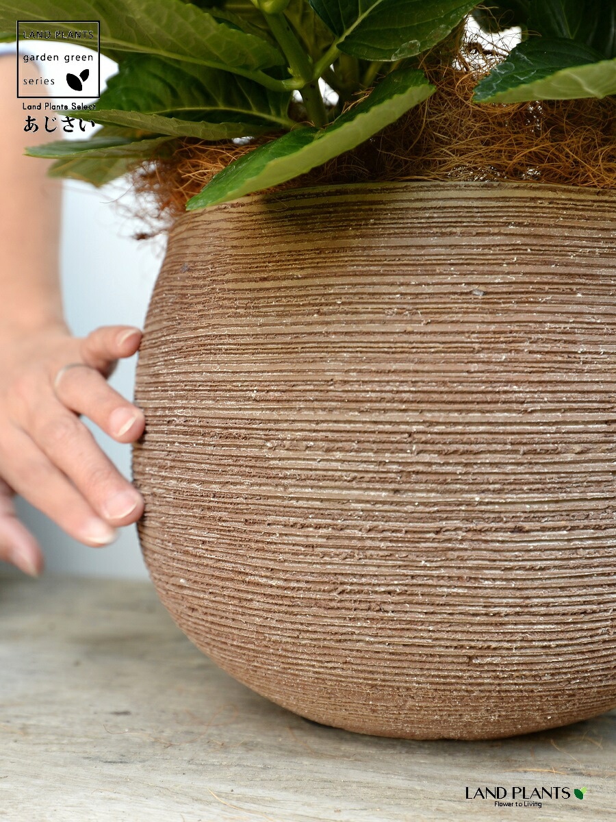 あじさい (青紫:ハワイアンブルー) ぽってり可愛い テラコッタ 横縞模様 【ココファイバー】紫陽花 アジサイ シチヘンゲ 七変化 ホンアジサイ ハイドランジア 素焼 陶器 茶 こげ茶 ブラウン ベージュ 花 鉢花 鉢植え 青 ブルー
