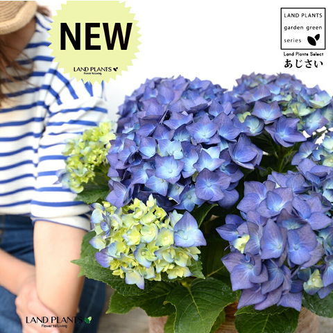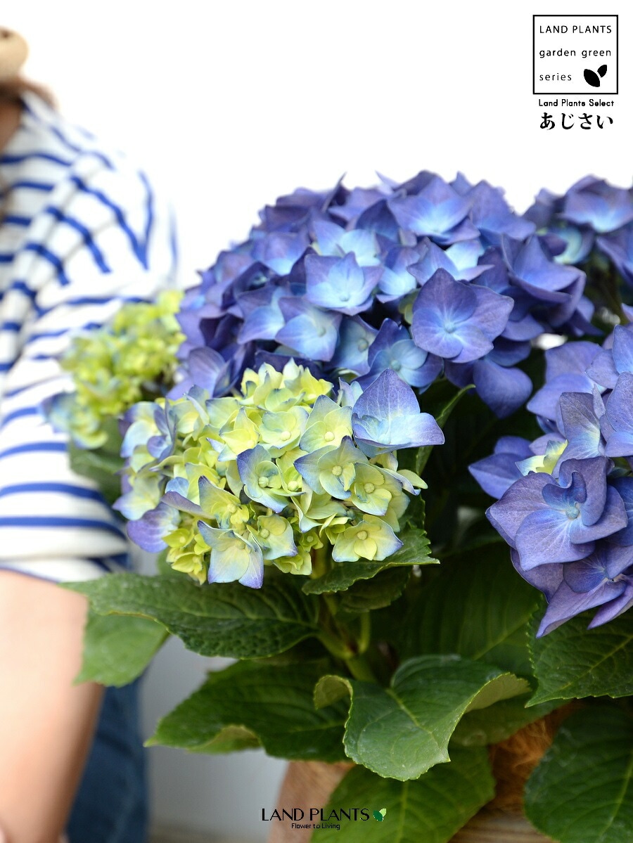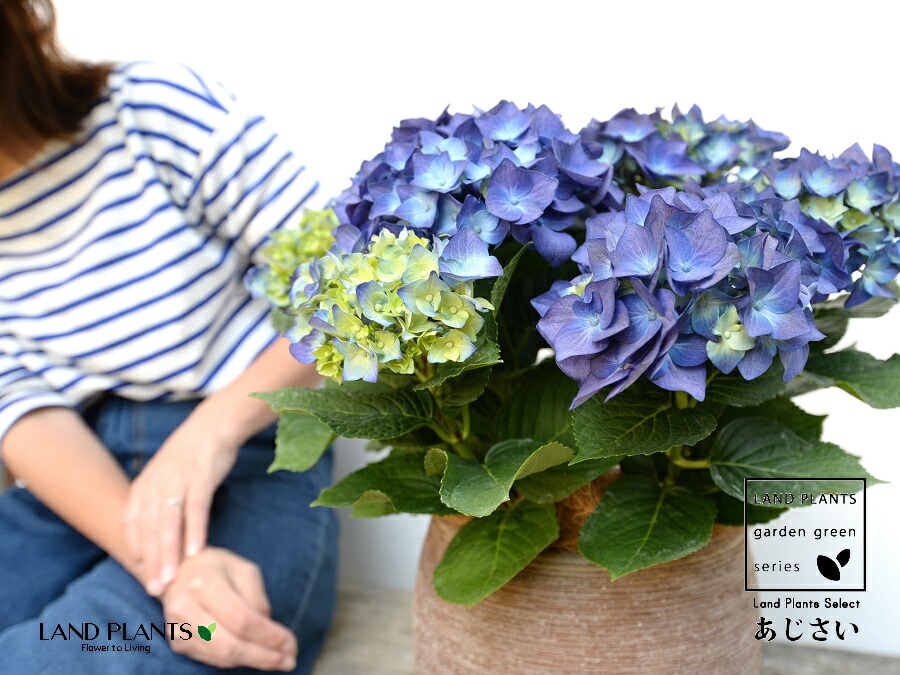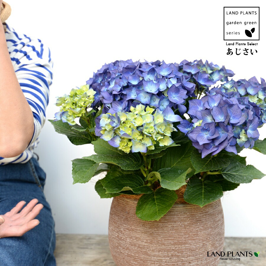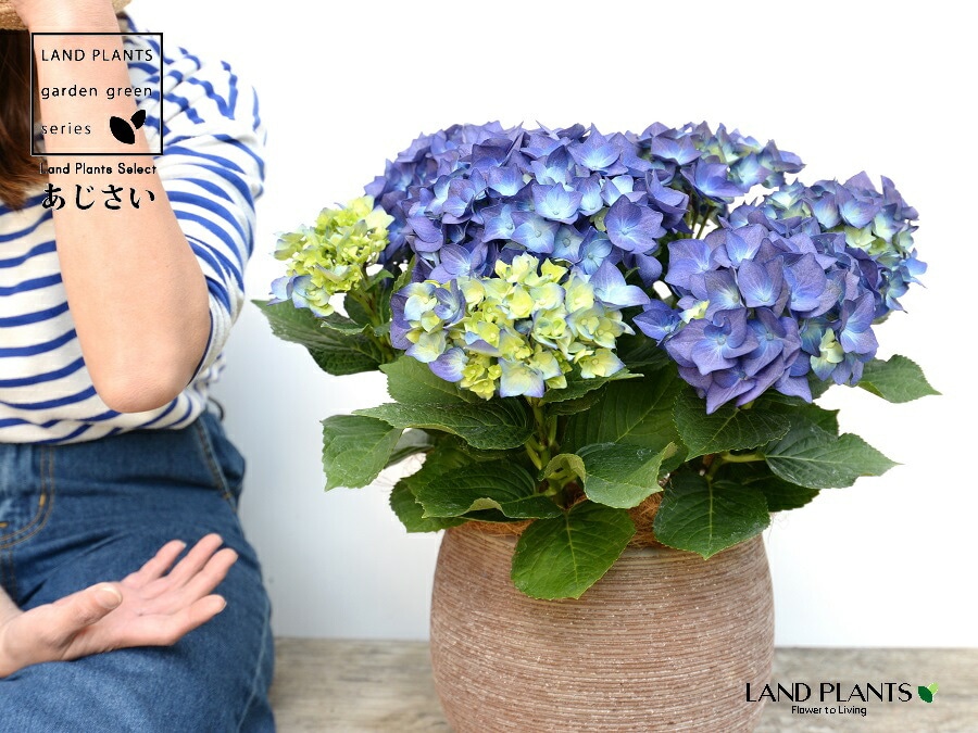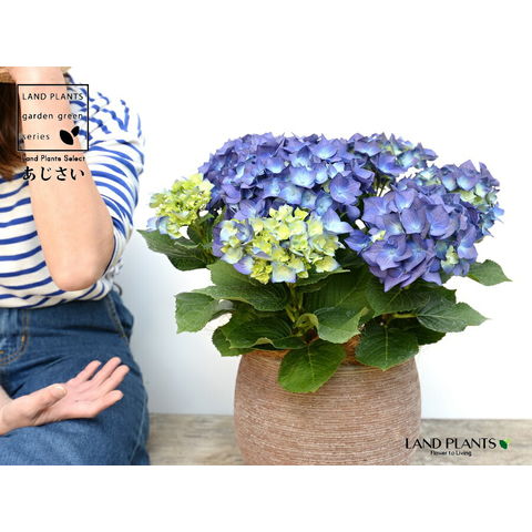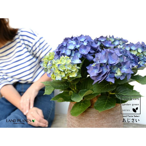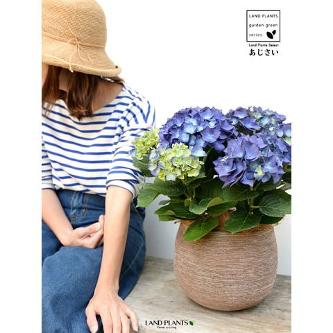 あじさい (青紫:ハワイアンブルー) ぽってり可愛い テラコッタ 横縞模様 【ココファイバー】紫陽花 アジサイ シチヘンゲ 七変化 ホンアジサイ ハイドランジア 素焼 陶器 茶 こげ茶 ブラウン ベージュ 花 鉢花 鉢植え 青 ブルー