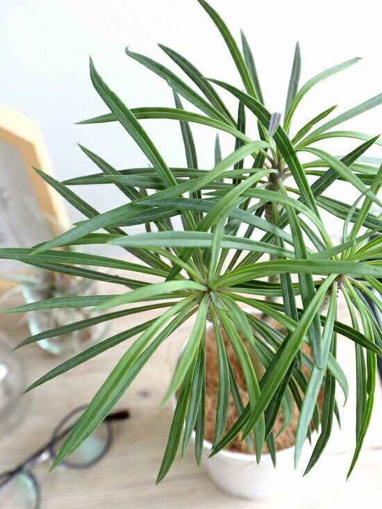 柔らかく落ち着いた色の葉。見た目も独特でお部屋のアクセントになります。幹の模様は古葉が落ちた成長の証なんです。