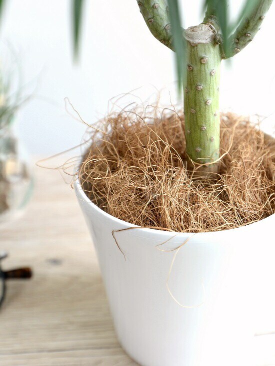 植物の足元、土にナチュラルなココヤシ繊維をふんわりとセットしています。このひと手間だけで植物のお洒落感がワンランクアップします!繊維の上からお水をかけられます。湿気が多い場合はココヤシ繊維を一時的に取り除いて様子をみてください。
