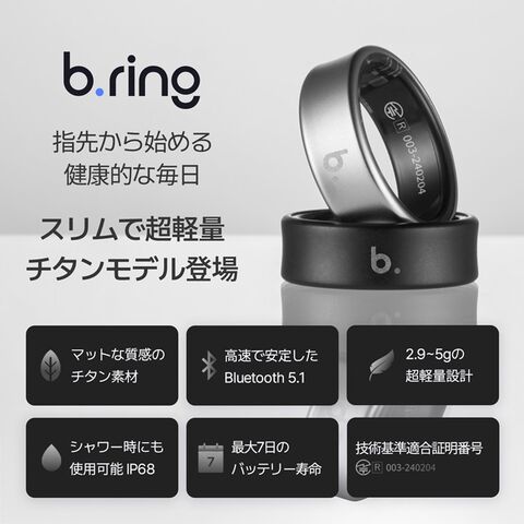 ■b.ringは、つけてるだけで生体情報を分析し毎日の健康をサポートするスマートリングです。日常生活に最適な着け心地とスタイリッシュなデザインが特徴です。