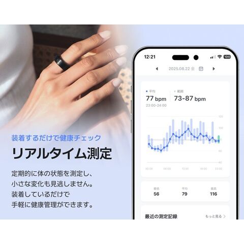 ■高精度なバイタルデータ測定(1)光血流センサー、加速度センサーなど精密なセンサーを搭載。小さなリングに搭載された精密なセンサーが、動作からバイタルサインまで指先で繊細に感知します。(2)生体信号をより正確に測定できる部位にフィット。信号を捉えるのに最適な‘‘指‘‘。指にしっかりフィットする事で高精度な計測を実現します。(3)眠りの時間も、パターンも。より細やかなデータであなたの睡眠を解析。細かく計測するパーソナライズド・スリープモニタリング。繊細な睡眠リズムをわかりやすく可視化します。