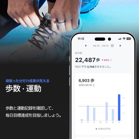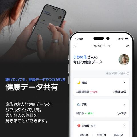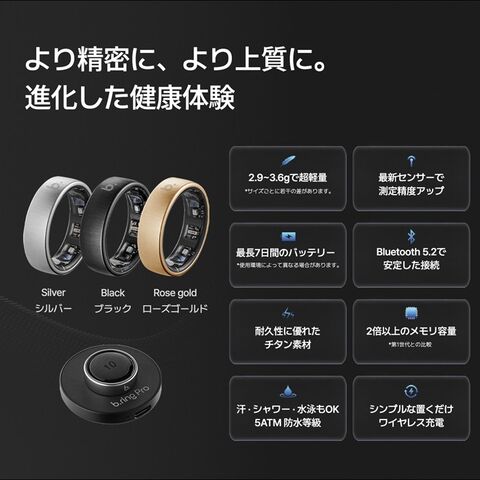 ■高精度なバイタルデータ測定(1)光血流センサー、加速度センサーなど精密なセンサーを搭載。小さなリングに搭載された精密なセンサーが、動作からバイタルサインまで指先で繊細に感知します。(2)生体信号をより正確に測定できる部位にフィット。信号を捉えるのに最適な‘‘指‘‘。指にしっかりフィットする事で高精度な計測を実現します。(3)眠りの時間も、パターンも。より細やかなデータであなたの睡眠を解析。細かく計測するパーソナライズド・スリープモニタリング。繊細な睡眠リズムをわかりやすく可視化します。