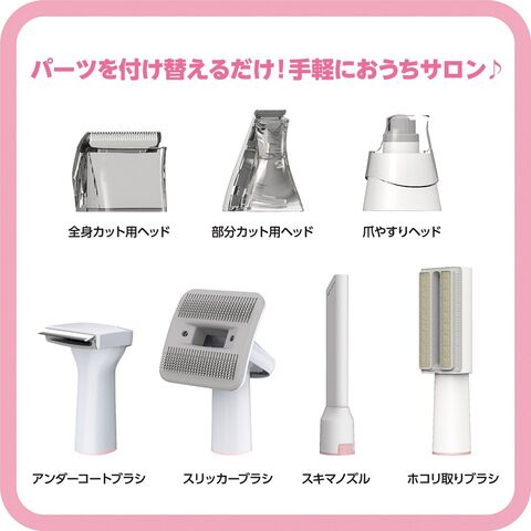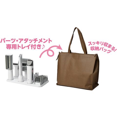 ■セット内容:掃除機本体、バリカン本体、全身カット用ヘッド(アタッチメント6個)、部分カット用ヘッド、爪やすりヘッド、スリッカーブラシ、アンダーコートブラシ、スキマノズル、ホコリ取りブラシ、収納用トレイ、パーツ収納用バッグ他