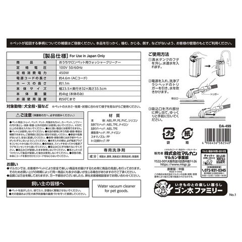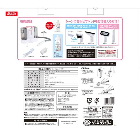 ■材質:本体/ABS・PP・PE・PVC・シリコン、洗浄ブラシヘッド/ABS・TPE・ナイロン、T型洗浄ヘッド/ABS・TPE、掃除用ヘッド/PP・ナイロン、スキマノズル/PP、ホース洗浄用キャップ/PP、専用洗浄剤/精製水・界面活性剤・消臭成分・酵素・除菌剤