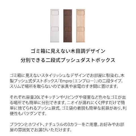 ■ゴミ箱に見えないスタイリッシュなデザインでお部屋に馴染む、木製プッシュ式ダストボックス『Empro(エンプロー)』の二段タイプ。スリムで場所を取らないので家具や家電のすき間に置けます。