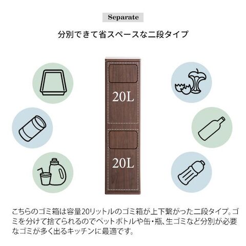 ■それぞれ容量20Lでキッチンやリビングや寝室など色々なゴミが出る場所でも簡単に分別できます。ニオイが漏れにくく押すだけで簡単に捨てられるプッシュ扉式。ゴミ袋の着脱も簡単な前扉があり、利便性もバツグンです。
