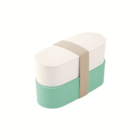 幅6.5cmのスリムサイズの2段式お弁当箱で、汁もれしにくいパッキン付きのフタが付いており、本体の内側には角がなく洗いやすい