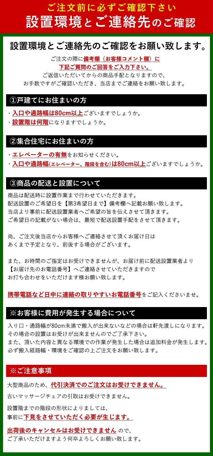 ・大型商品の為、設置する場所、入口・通路幅(エレベーター、階段を含む)が80cm以上で搬入可能かどうかをご確認の上、お申込み頂きますようお願いいたします。