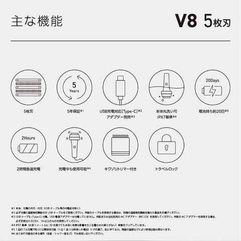 ※3 フル充電し1 日1 回3 分使用の場合。ヒゲの濃さ、肌にあてる力、周囲の温度などにより使用日数は異なります。