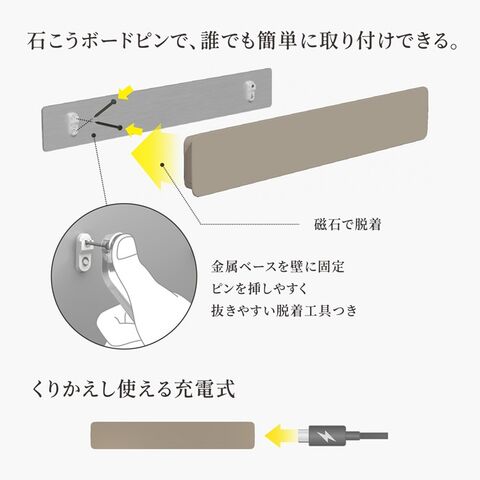 ■石膏ボードピンで固定するため壁も傷つきにくく、簡単に設置することが可能です。本体は磁石で脱着可能。充電時もサッと取り外すことができます。