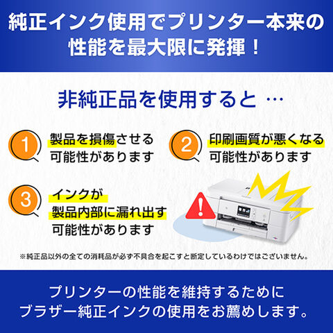 ●ブラザー純正インクは製品本体の性能を十分に発揮するために研究を重ね、開発されています。非純正インクをお使いになりますと製品本体の性能を十分に発揮できないだけでなく製品本体を損傷させる可能性がありますのでご注意ください。