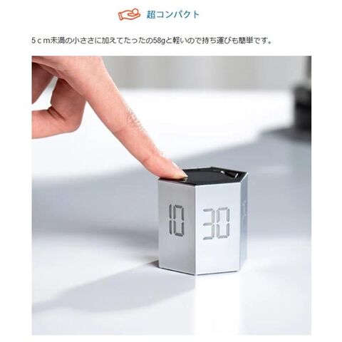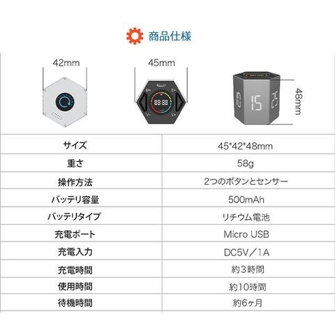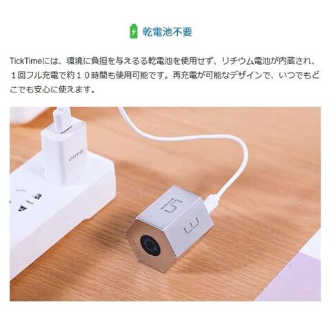 ●キューブタイマーは環境に負担を与えるる乾電池を使用せず、リチウム電池が内蔵され、1回フル充電で約10時間も使用可能です。再充電が可能なデザインで、いつでもどこでも安心に使えます。