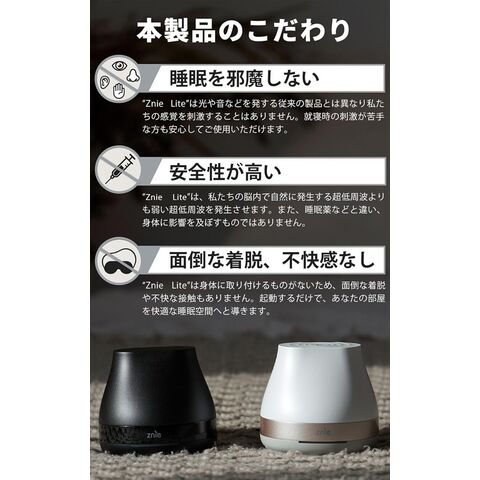 ■『Znie Lite』は、快適な睡眠習慣をサポートするために設計されたスリープテックデバイスです。入眠や眠り続けるのに苦労している人に向けて開発されました。超低周波 (ELF)を生成する『Znie Lite』は、五感を刺激しすぎたり、ライフスタイルを大きく変えたりすることなく、健康的な睡眠スタイルを提案します。
