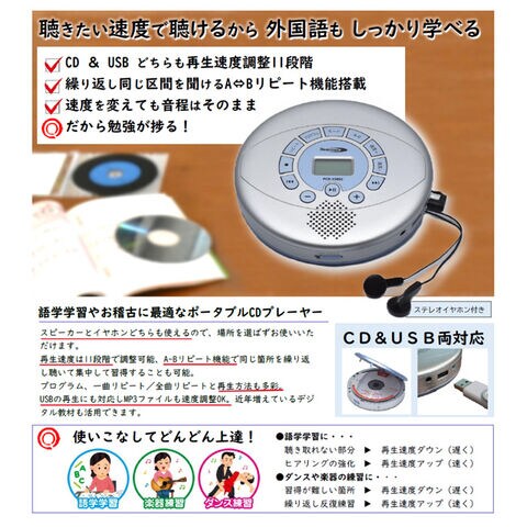 CDやUSBメモリ内のMP3音源を11段階の速度で調整できるポータブルCD/MP3プレーヤーです。
