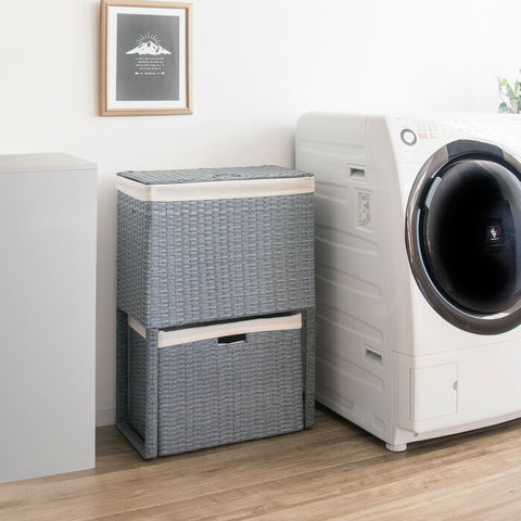 ■衣類がたっぷり置けて取り出しやすく、分別もできる縦型2段式のラタンランドリーボックス。