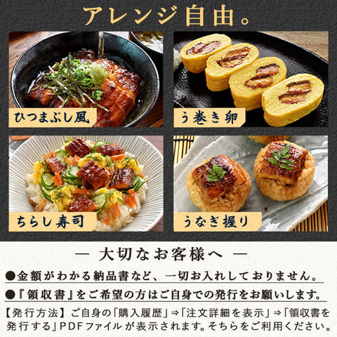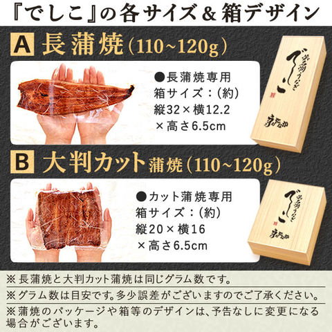 | 内容量 | A.長蒲焼(110~120g) 2本 B.カット蒲焼(110~120g)2枚 たれ、さんしょう、吸い物 |
