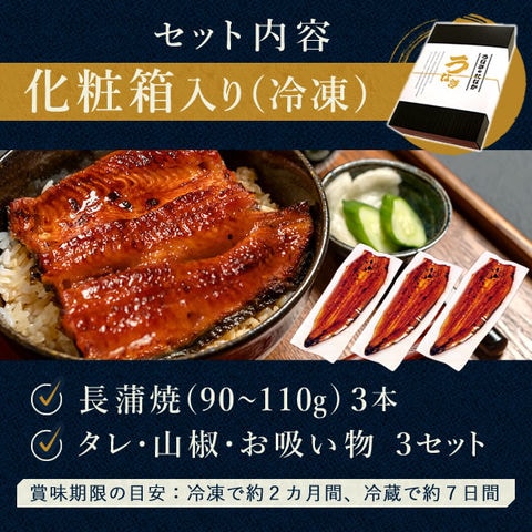| 内容量 | 長蒲焼 90-110グラム 3本 たれ、さんしょう、吸い物 |