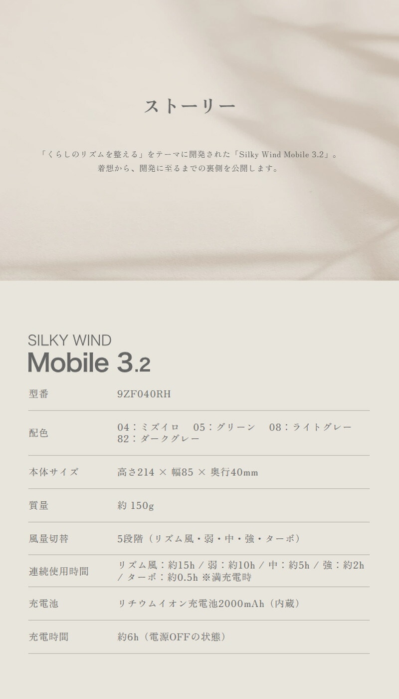 連続使用時間 (リズム風)約15h、(弱)約10h、(中)約5h、(強)約2h、(ターボ)約0.5h ※満充電時
