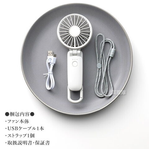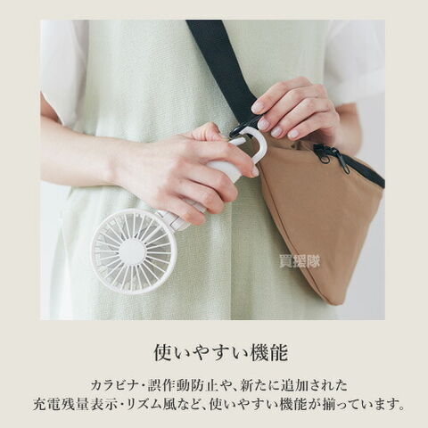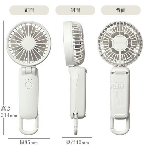 機能 長寿命のDCブラシレスモーター、USB充電(CtoC対応)、充電時間 約6時間(電源OFF状態)(USB Power Delivery 未対応)、充電切れ予告表示(LED3灯でお知らせ)、誤動作防止機能(ボタン1秒長押しで電源ON/OFF)、風向き角度調整(前後方向)/無段階(0~110度)、カラビナ付き