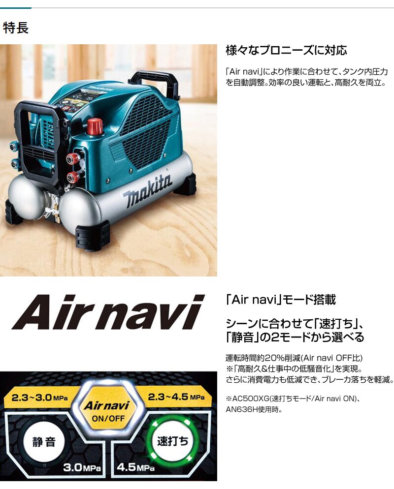 【様々なプロニーズに対応】「Air navi」により作業に合わせて、タンク内圧力を自動調整。