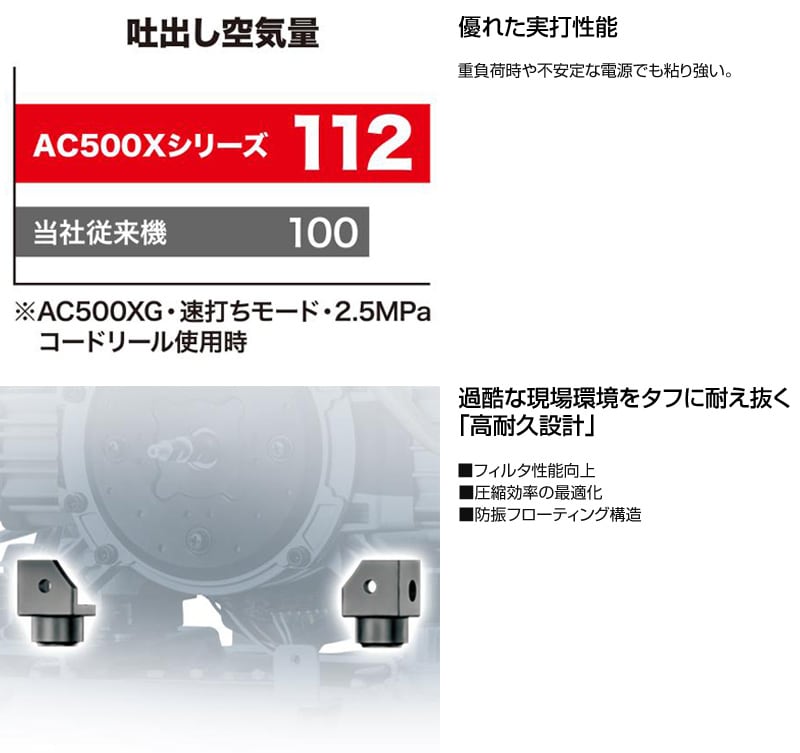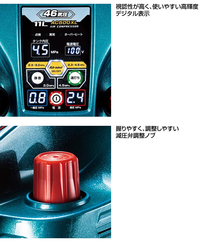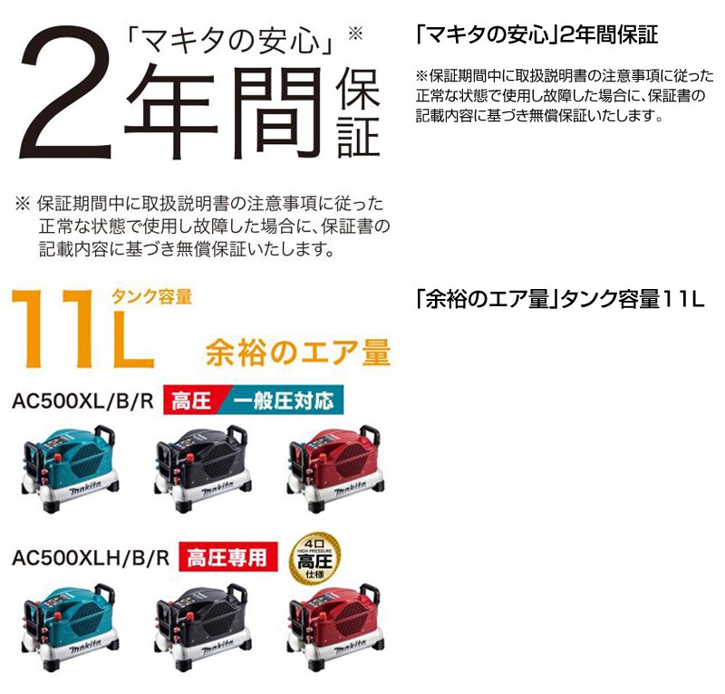 マキタ エアコンプレッサ 11L 4口 一般圧専用 AC500XLN 【耐久性 低騒音 圧力自動調整 プロ 速打ち 2×4工法 在来工法 上棟 床張り 下地作業 内装作業 リフォーム 実打性 工具 電動工具 DIY ツール 工具 用品 makita】【おしゃれ おすすめ】