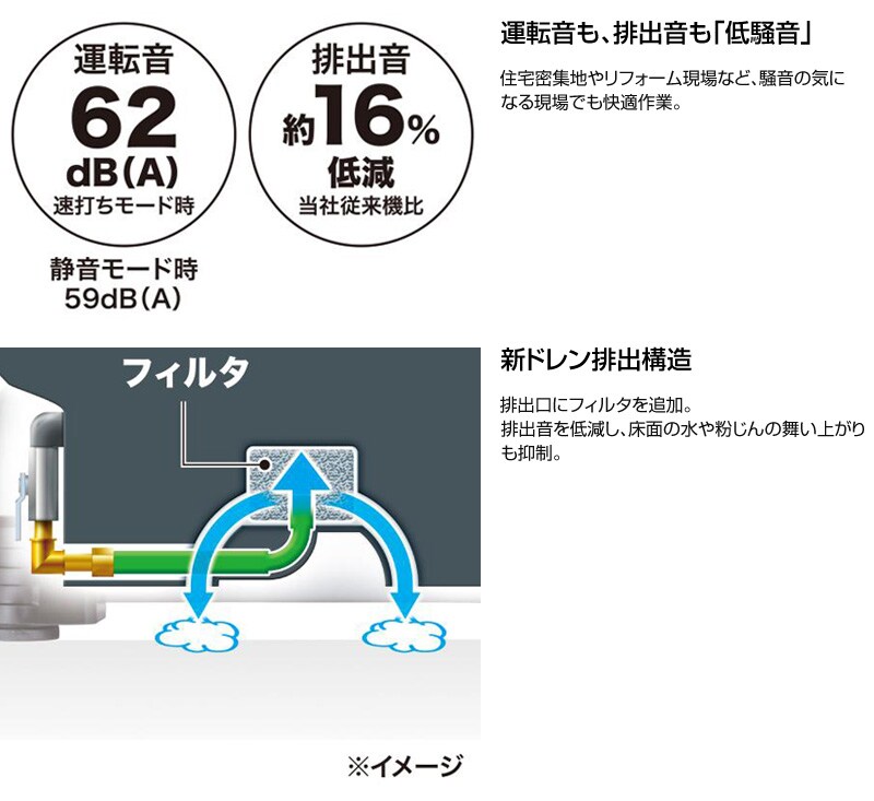 【運転音も、排出音も「低騒音」】住宅密集地やリフォーム現場など、騒音の気になる現場でも快適作業。
