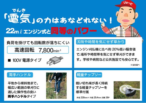 【刈払 草刈 芝刈 草刈り 芝刈り リョービ 電動式 雑草 住宅地 市街地 京セラ キョウセラ リョービ リョウビ 電気 刈払機 AK-6000 AK6000 697700A 雑草 快適 刈込み 環境 やさしい 軽量チップソー 草刈作業 100V AC 230mm】