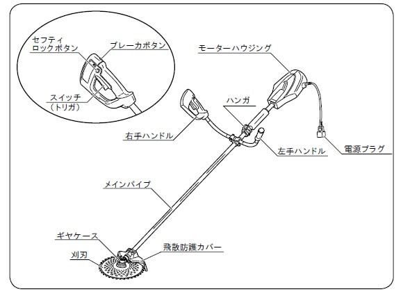 ![]() | ・使用中、刈刃に草などが巻き付いたり、モーターに過負荷がかかると、過負荷保護装置が働き電源が切れます。作業を再開する場合は、必ず電源プラグを抜き、過負荷の原因を取除いた後、約30 秒待ってブレーカボタンを押込んでください。 |