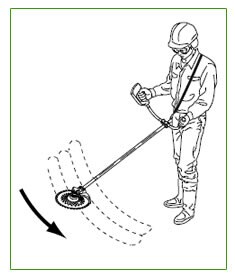 ![]() | ※付属の説明書の注意事項をご確認の上、ご使用下さい。 ・ハンドルを両手でしっかり握り、刈刃の回転方向に合わせて体重の移動が容易で安全な体勢を作ります。 ・スイッチを入れ、刈刃の回転が十分上がってから草刈作業を開始します。 ・メインパイプだけを振回さず腰の回転によって操作します。刈刃が左回転のため右から左に移動するようにして草刈りを行ないます。右から左へ刈ると効率的な作業ができます。 |