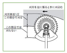 ![]() | ・刈刃直径の1/2 の部分で刈ると、切り味がよく、また草の巻き込みも少なく能率的です |