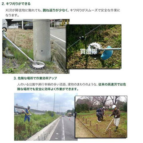 人のいる公園や通行車輌の多い道路、建物のまわりのような、従来の高速刃では危険な場所でも安全に効率よく作業ができます。