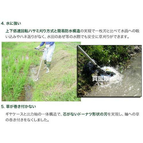 上下低速回転ハサミ刈り方式と簡易防水構造の実現で一枚刃と比べて水面への吸い込みや跳ね返りがなく、水田のあぜ等の水際でも安全に草刈りができます。