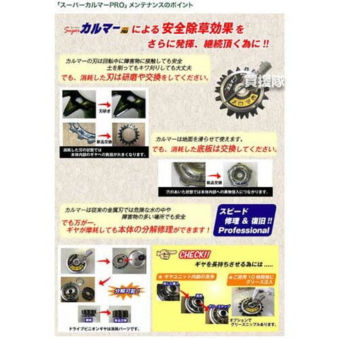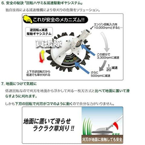 この減速機構と上下刃の回転ハサミ駆動により、低速回転でも効率よく草が刈れ、石などの飛散を抑制できます。