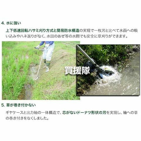 「スーパーカルマーPro」は、上下刃逆回転のハサミ刈り方式で高い刈取性能を維持しつつ低速回転での刈り払いができるため、飛散事故や切創事故の防止に効果が見込めます。