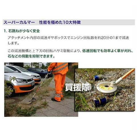 「スーパーカルマーPro」は、上下刃逆回転のハサミ刈り方式で高い刈取性能を維持しつつ低速回転での刈り払いができるため、飛散事故や切創事故の防止に効果が見込めます。