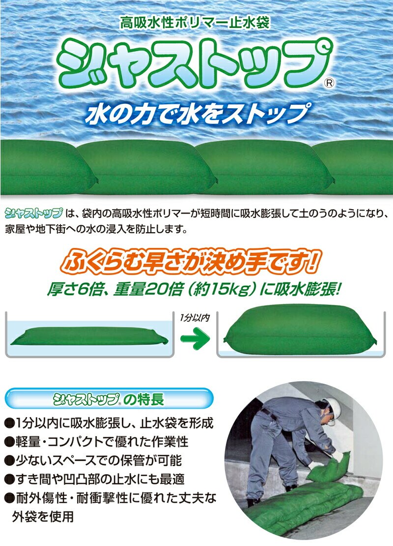 ポリエステル系不織布の袋に充填した特殊な吸水体に水を吸わせ、短時間に膨張させることで、梅雨時や台風シーズンの集中豪雨や水道事故などによる家屋や地下街などへの侵入水を「土のう」の様に堰止める役目を果たします。