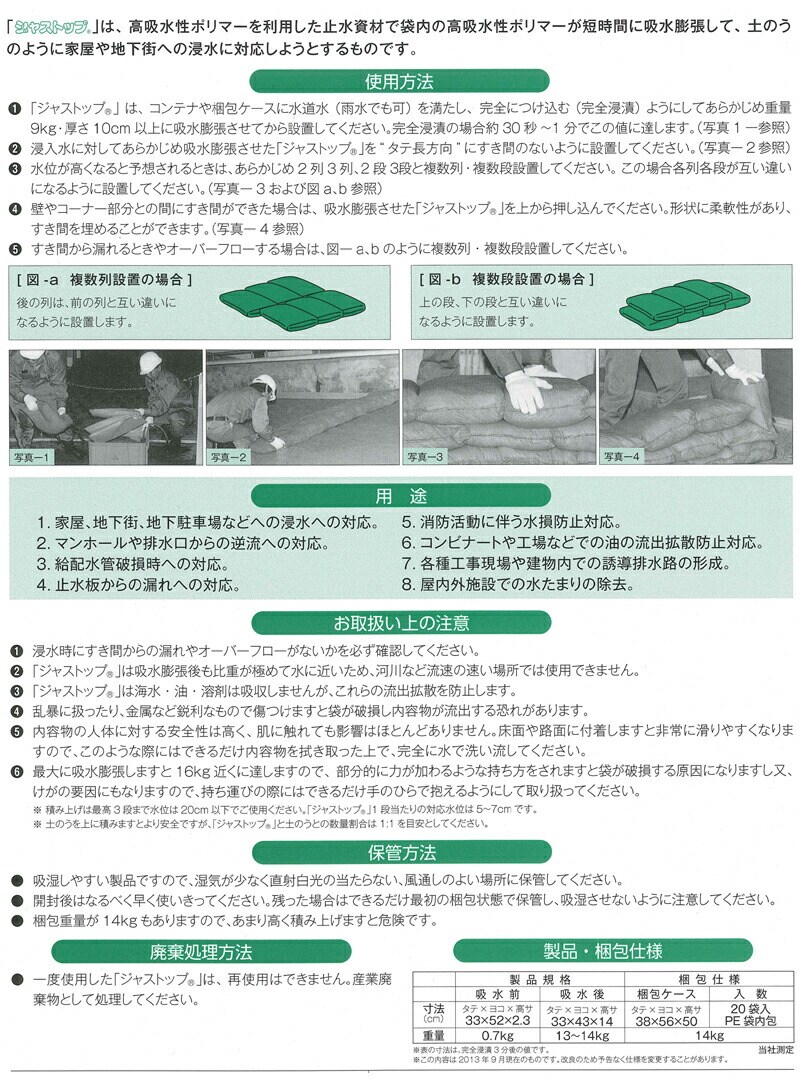 「ジャストップ」は高吸水性ポリマーが短時間に吸水膨張する性質を高度に利用した画期的な水防資材です。