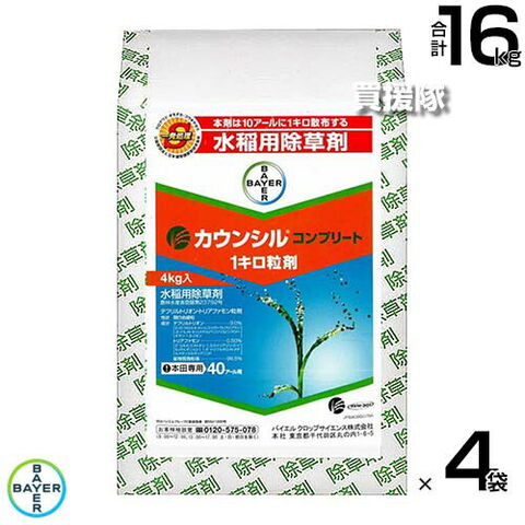 《法人限定》バイエル カウンシルコンプリート1キロ粒剤 4kg×4袋セット 【安全性 鉄コーティング 直播 水稲 すいとう 水田 田んぼ 稲 イネ 水稲栽培 用 除草剤 雑草 草 対策 ノビエ 3.5葉期 クログワイ オモダカ】【おしゃれ おすすめ】