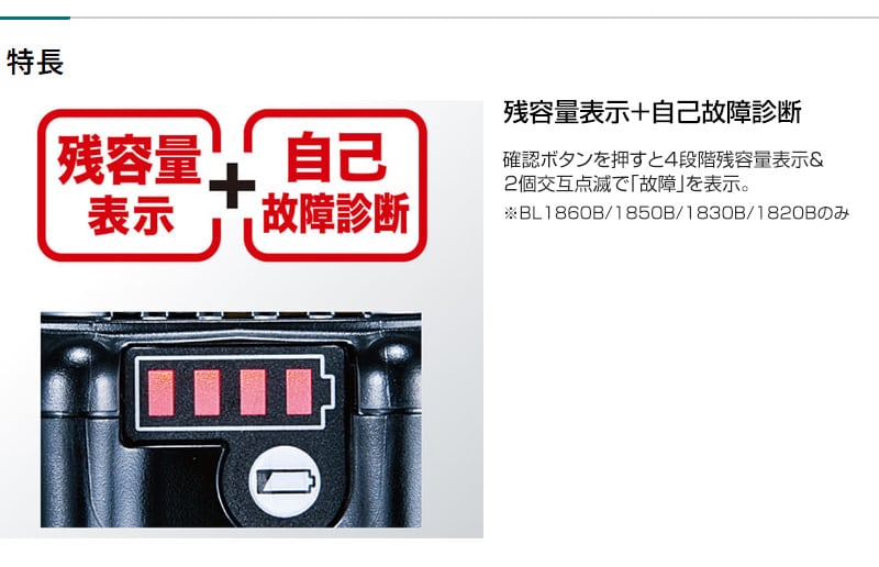 確認ボタンを押すと4段階残容量表示&2個交互点滅で「故障」を表示。(※BL1860B/1850B/1830B/1820Bのみ)