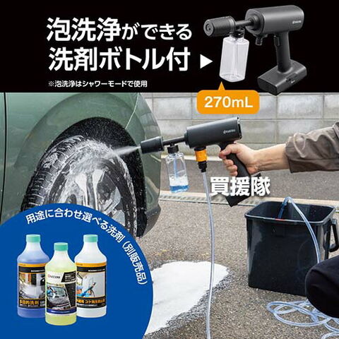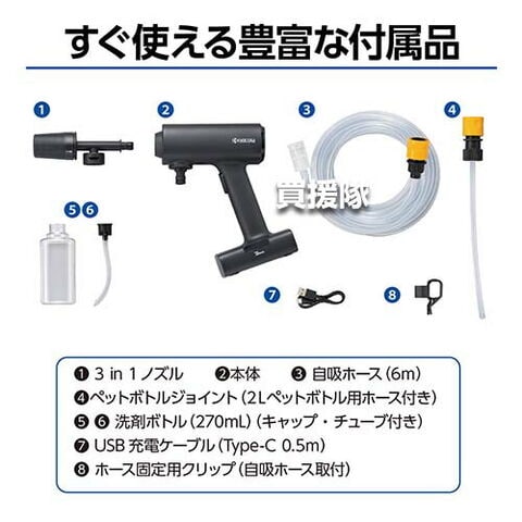付属品 3in1ノズル×1、ペットボトルジョイント×1、洗剤ボトル(270mL)×1、自吸ホース6m(ホース固定用クリップ付)×1、USB充電ケーブル(Type-C 0.5m)×1