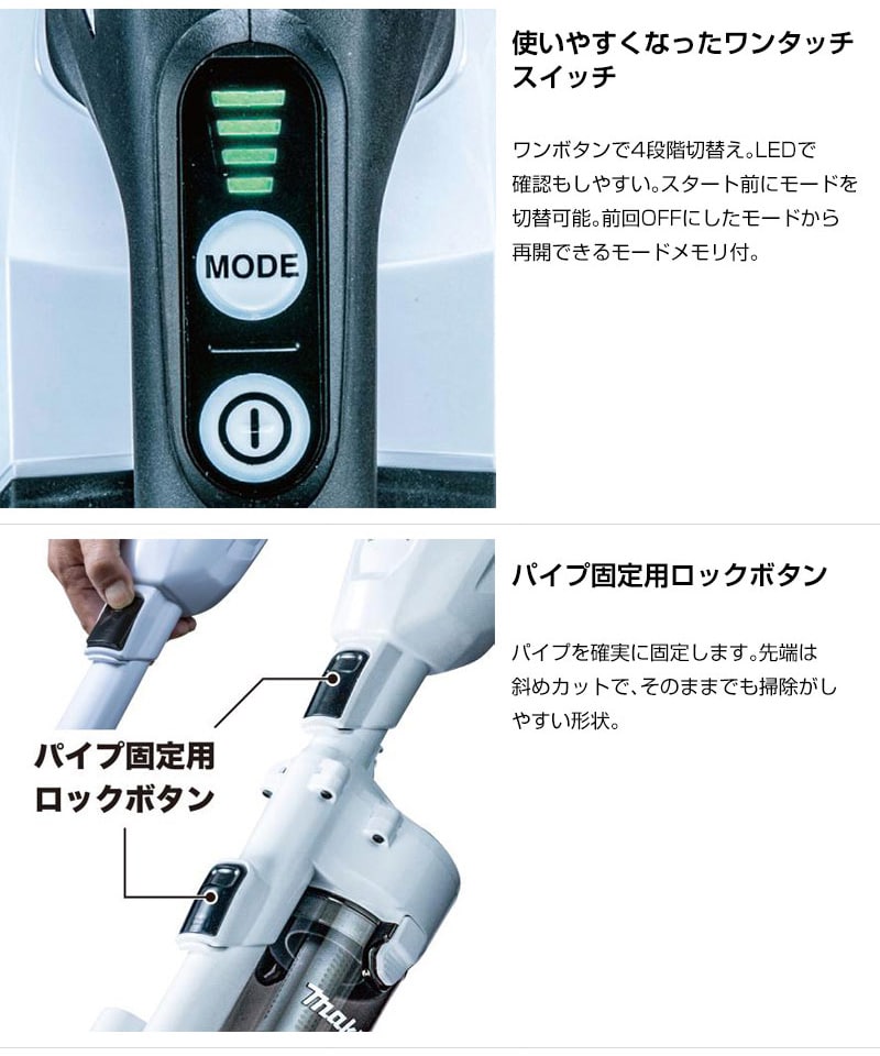 【パイプ固定用ロックボタン】パイプを確実に固定します。先端は斜めカットで、そのままでも掃除がしやすい形状。