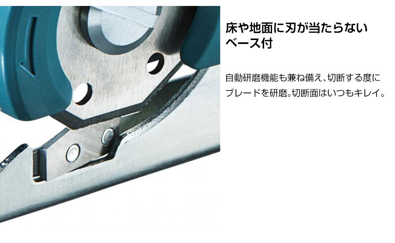 【床や地面に刃が当たらないベース付】自動研磨機能も兼ね備え、切断する度にブレードを研磨。切断面はいつもキレイ。
