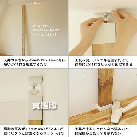 ●取り付けに工具は不要。天井と床をしっかり固定します。